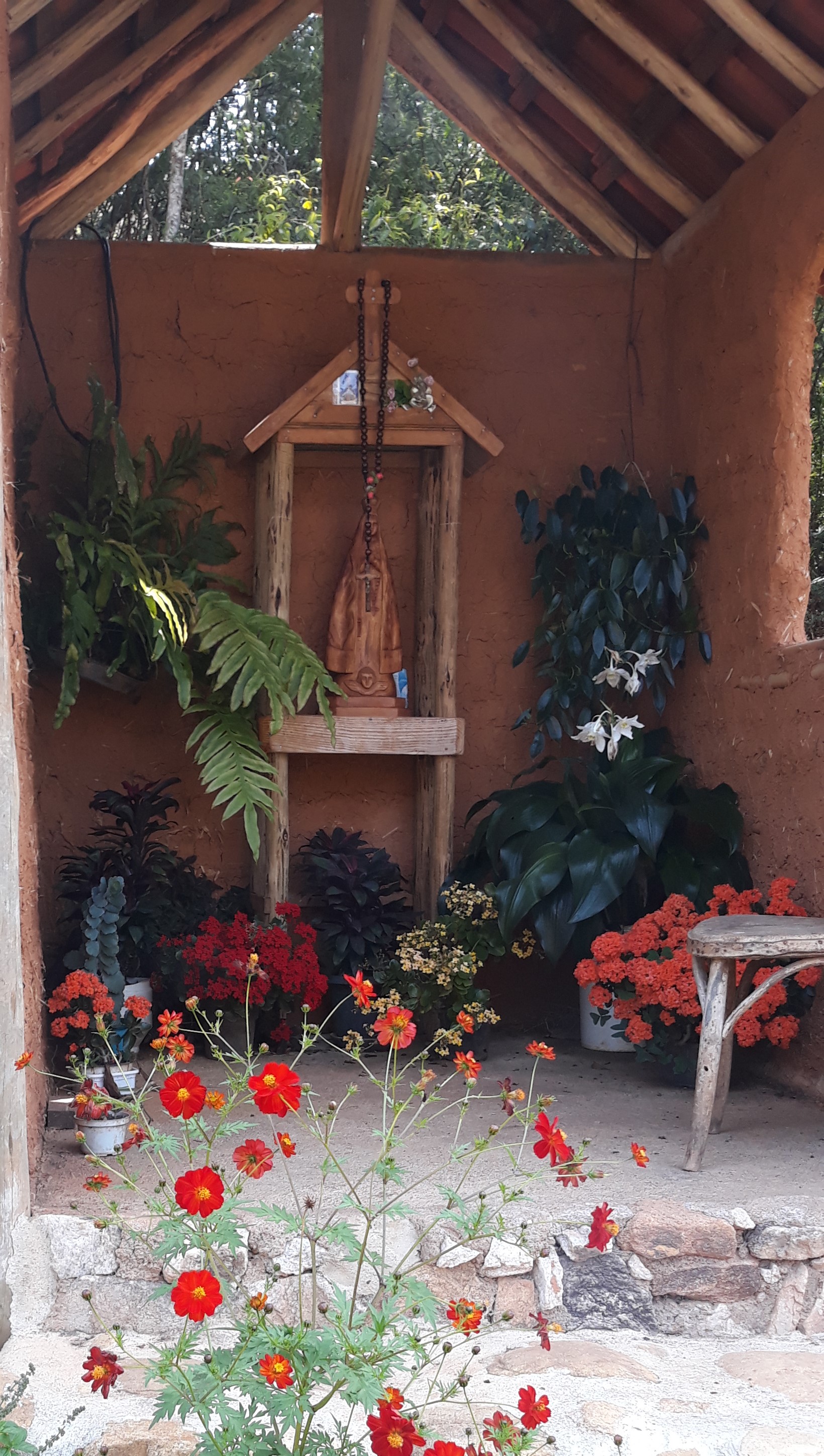 A. F. – Ah, então é! Por isso que a gente pôs o nome aqui também! Aqui era Fazenda Monte Verde, mas só que tem outra ali, que chama Fazenda Monte Verde, aí vai ficar duas, perto, né? A gente pôs Fazenda Aliança da Mantiqueira… Depois que a gente comprou, a aliança da família que se uniu pra comprar e Mantiqueira por causa da serra da Mantiqueira. Foi muito bom, nossa! Pra minha família toda! Pros meus irmãos todos. Nossa, ficaram muito felizes de voltar aqui! Poder chegar e encontrar de volta onde a gente foi criado. Às vezes as minhas irmãs chegam, choram toda vida, demoram pra entrar dentro de casa, só olhando. Nossa! Vendo as coisas todas aí. O ano passado até a gente fez a capelinha, colocou Nossa Senhora, que meu pai é muito devoto de Nossa Senhora de Aparecida, né? Aí, dia 12 de outubro do ano passado a gente queria reunir todo mundo, pelo menos os irmãos… A minha mãe era viva ainda o ano passado… Mas acabou que choveu muito! Estava chovendo muito e acabou vindo só seis irmãos. Minha mãe nem veio… Ela acabou falecendo em março, nem chegou a ver a capelinha. Ela faleceu dia 18 de março, ia fazer 91 anos dia 19 de março. No dia do sepultamento dela, a família quase toda estava reunida, acabou de jantar e saiu… Aí o S. F. sentiu um cheiro muito forte de lavanda! Ele sentiu aquele cheiro forte de lavanda, e não foi só ele, foi a minha nora e o meu marido também! Ele pegou e falou assim: “Vou olhar ali na capelinha. Deve ser a esposa do S. G. que pôs alguma lavanda ali”… Não tinha colocado nada! Então, eu acho que a minha mãe veio nos visitar, ela e meu pai… Eu acredito nisso, sim! Depois que ele me contou, eu chorei toda vida… Aquilo me arrepiava toda! Foi ela que veio visitar, sim, com certeza! Mas eu queria muito que ela tivesse vindo no dia que a gente fez a celebração… Ela já tinha Alzheimer. Eu, às vezes, a trazia pra passear aqui, pra ficar comigo… Cada semana uma das filhas ficava. E mesmo ela tendo Alzheimer, chegava aqui e conhecia, lembrava de tudo! Falava: “Ali tinha um moinho, eu vinha trazer milho pra moer”… E tinha mesmo, onde é a piscina hoje. Minha mãe só faleceu porque ela caiu… Assim, do nada! Ela estava indo pra sala, andando normal, quando ela caiu. O médico fala que ela quebrou, por isso que ela caiu. Mas não teve como fazer a cirurgia… Durou acho que 15 dias, tentou fazer a cirurgia, mas não teve jeito… Deus sabe! Depois disso, o S. F. trouxe aqueles beijinhos, pra gente plantar na capela, está bonitinho…
