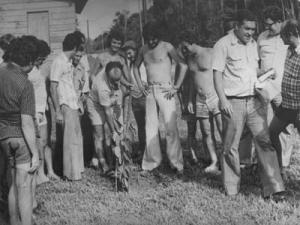 R – Nas costas. Porque eu era muito levado, e antigamente, no colégio, tinha a palmatória nessa época. Ela me deu uma flechada, doeu, e eu tomei dela e meti-lhe a flechada. Dona Raimunda, o nome dessa professora. Depois de grande eu encontrava com ela, ela olhava pra mim e ria, dizia assim: “Foi esse que me bateu”.