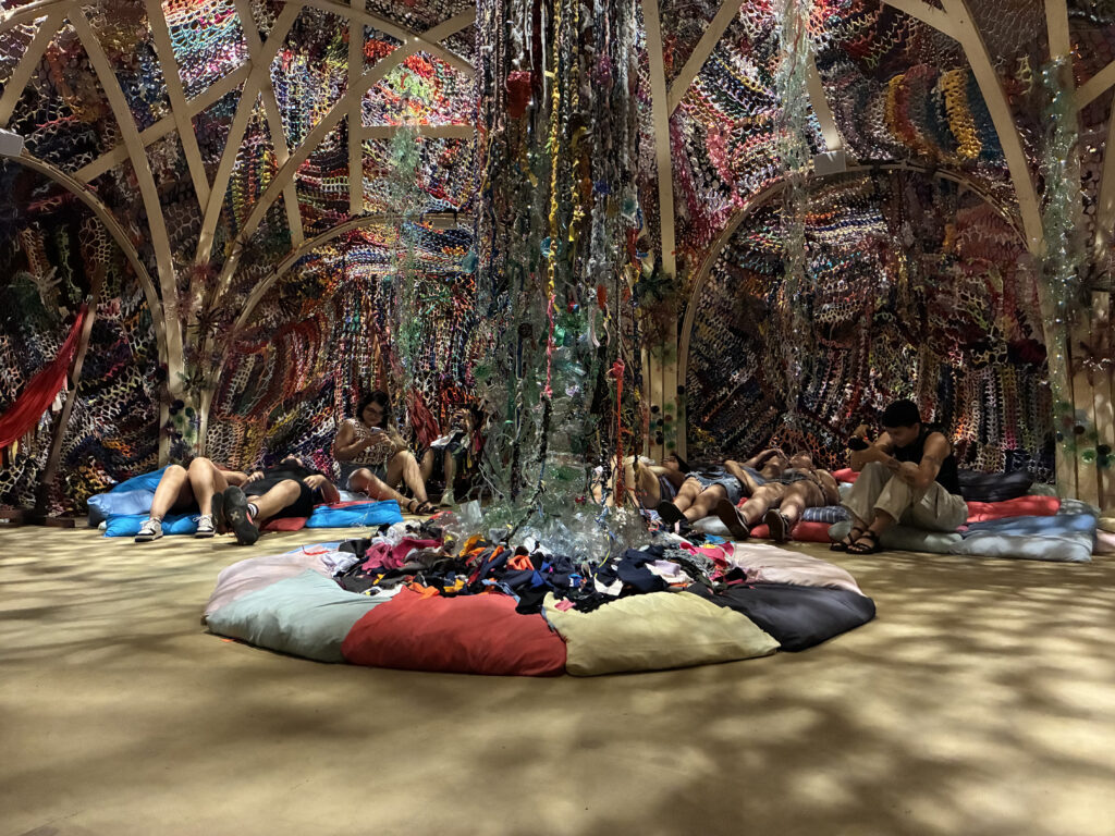 Esse manto, criado ao longo de 2024 e 2025 com a participação de mais de 200 pessoas e 15 organizações, incorpora memórias e paisagens de vários territórios. Ao mesmo tempo, jogos de luzes atravessam a instalação e se combinam com uma trilha sonora que mistura vozes humanas, sons da natureza e ruídos do cotidiano. Assim, a experiência provoca uma escuta ampliada, mais sensível e atenta ao que normalmente passa despercebido.